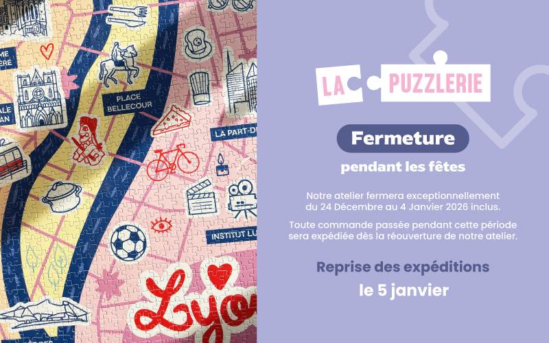 Sur notre boutique en ligne, vous avez la possibilité de commander nos puzzles, quelques soit le nombres de pièces, aussi bien à l'unité qu'en grande quantité. Nous avons de très bons avis concernant la qualité d'impression de nos produits. Si vous ne trouvez pas les thèmes qu'il vous faut parmi nos sélections d'articles, vous pouvez aussi personnaliser votre puzzle comme bon vous semble. Ajoutez votre photo favorite ou votre logo et hop le tour est joué ! Pour cela rien de plus simple, rendez-vous sur notre outil de personnalisation en ligne pour commencer vos futurs cadeaux personnalisés. Observez nos dimensions et choisissez vos nombres de pièces pour commencer votre œuvre d'art avec votre photo. Vous pouvez télécharger la photo que vous voulez : Une photo de vos animaux, des véhicules préférés de vos enfants ou la dernière photo de famille à Disney, tout est possible ! Contrairement à Ravensburger, Eurographics, Castorland, Nathan, Clementoni ou encore Galison, nous nous efforçons de vous proposer une interface d'utilisation moderne et des puzzles de qualité imprimés en France dans notre atelier. Alors n'attendez plus et passez votre première commande de puzzles avec brio !